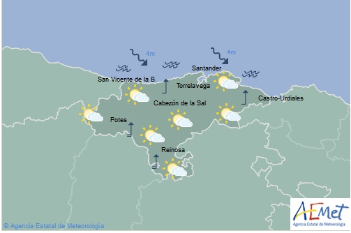 Temperaturas máximas y mínimas previstas: Cabezón de la Sal, 19 y 6 grados; San Vicente de la Barquera, 18 y 5; Santander, 17 y 8; Castro Urdiales, 17 y 8; Potes, 15 y 1; Reinosa, 11 y -2; y Torrelavega, 19 y 8 grados.