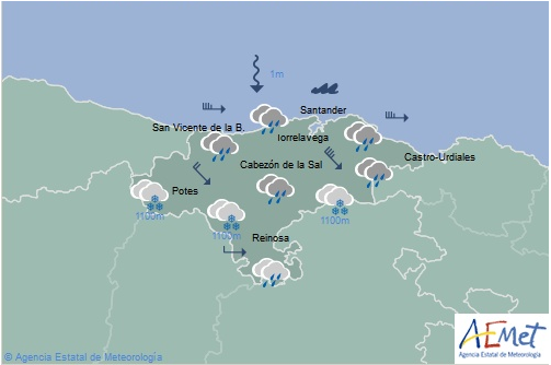 Temperaturas máximas y mínimas previstas: Cabezón de la Sal, 13 y 8 grados; San Vicente de la Barquera, 14 y 8; Santander, 14 y 10; Castro Urdiales, 13 y 8; Potes, 11 y 5; Reinosa, 8 y 2; y Torrelavega, 13 y 9 grados.