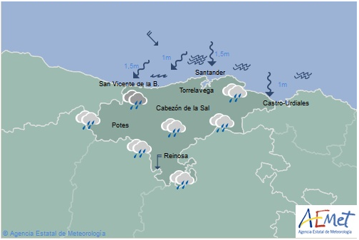 Temperaturas máximas y mínimas previstas: Cabezón de la Sal, 17 y 11 grados; San Vicente de la Barquera, 18 y 11; Santander, 19 y 11; Castro Urdiales, 18 y 10; Potes, 17 y 8; Reinosa, 13 y 3; y Torrelavega, 17 y 13 grados.
