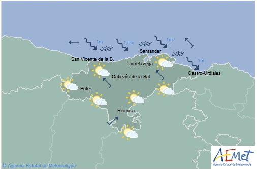 Temperaturas máximas y mínimas previstas: Cabezón de la Sal, 23 y 12 grados; San Vicente de la Barquera, 23 y 14; Santander, 23 y 15; Castro Urdiales, 22 y 16; Potes, 26 y 10; Reinosa, 21 y 9; y Torrelavega, 24 y 13 grados.