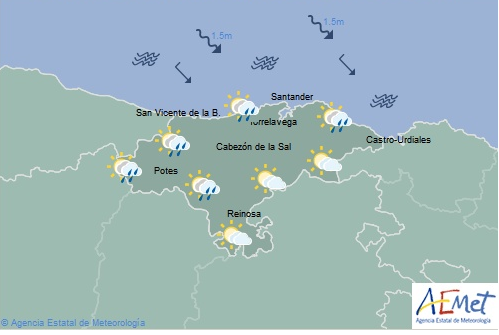 Temperaturas máximas y mínimas previstas: Cabezón de la Sal, 22 y 15 grados; San Vicente de la Barquera, 22 y 16; Santander, 24 y 17; Castro Urdiales, 23 y 17; Potes, 24 y 13; Reinosa, 22 y 9; y Torrelavega, 22 y 16 grados.