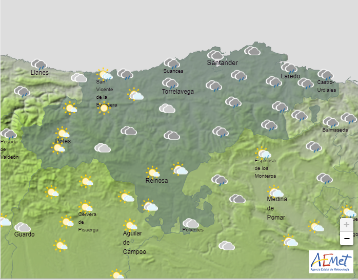 La Agencia Estatal de Meteorología (AEMET) prevé en Cantabria para este miércoles, día 26, cielo muy nuboso o cubierto, con lluvias débiles que podrían ser localmente moderadas, excepto en el extremo sur, donde no se esperan precipitaciones. La cota de nieve estará en torno a 1.000-1.200 metros.