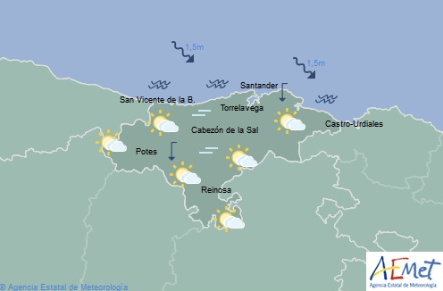 Temperaturas máximas y mínimas previstas: Cabezón de la Sal, 24 y 16 grados; San Vicente de la Barquera, 23 y 19; Santander, 24 y 17; Castro Urdiales, 24 y 17; Potes, 27 y 15; Reinosa, 26 y 11; y Torrelavega, 24 y 16 grados.