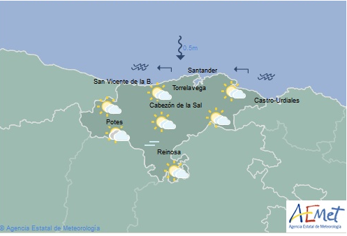 Temperaturas máximas y mínimas previstas: Cabezón de la Sal, 20 y 13 grados; San Vicente de la Barquera, 20 y 13; Santander, 20 y 12; Castro Urdiales, 20 y 12; Potes, 22 y 10; Reinosa, 18 y 11; y Torrelavega, 21 y 12 grados.
