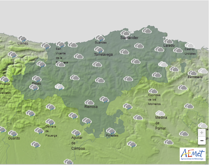 Temperaturas mínimas y máximas previstas: Cabezón de la Sal, 11 y 16 grados; Castro Urdiales, 11 y 16; Potes, 5 y 14; Reinosa, 5 y 11; San Vicente de la Barquera, 10 y 15; Santander, 12 y 16, y Torrelavega, 10 y 16 grados.