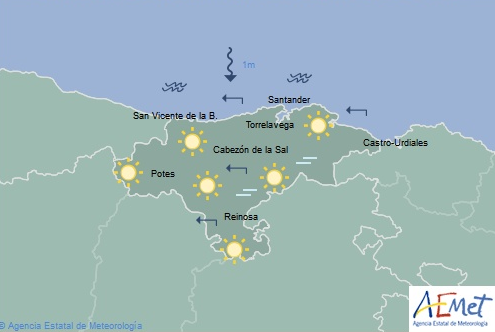 Temperaturas máximas y mínimas previstas: Cabezón de la Sal, 24 y 12 grados; San Vicente de la Barquera, 23 y 13; Santander, 24 y 14; Castro Urdiales, 22 y 14; Potes, 25 y 9; Reinosa, 23 y 6; y Torrelavega, 25 y 13 grados.