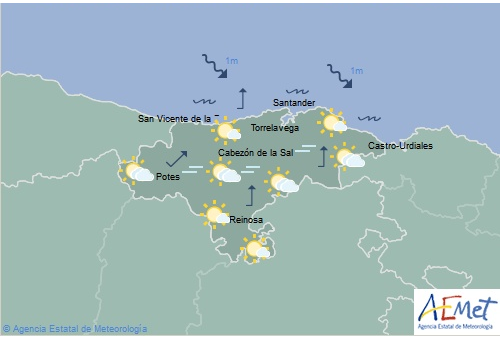 Temperaturas máximas y mínimas previstas: Cabezón de la Sal, 22 y 12 grados; San Vicente de la Barquera, 22 y 13; Santander, 22 y 13; Castro Urdiales, 21 y 13; Potes, 24 y 9; Reinosa, 21 y 7; y Torrelavega, 22 y 12 grados.
