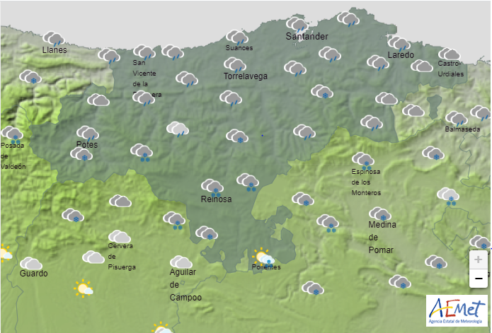 Temperaturas mínimas y máximas previstas: Cabezón de la Sal, 14 y 21 grados; Castro Urdiales, 16 y 22; Potes, 12 y 24; Reinosa, 8 y 20; San Vicente de la Barquera, 16 y 21; Santander, 17 y 22, y Torrelavega, 14 y 22 grados.
