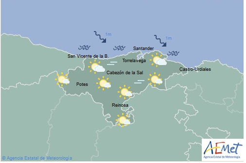 Temperaturas máximas y mínimas previstas: Cabezón de la Sal, 25 y 18 grados; San Vicente de la Barquera, 24 y 18; Santander, 25 y 19; Castro Urdiales, 23 y 18; Potes, 30 y 17; Reinosa, 29 y 11; y Torrelavega, 27 y 18 grados.