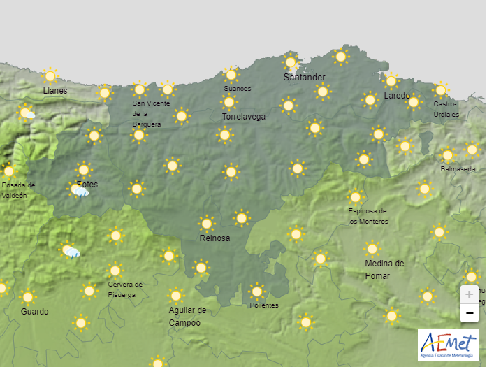 Temperaturas mínimas y máximas previstas: Cabezón de la Sal, 16 y 36 grados; Castro Urdiales, 19 y 37; Potes, 20 y 38; Reinosa, 17 y 34; San Vicente de la Barquera, 17 y 34; Santander, 18 y 36, y Torrelavega, 18 y 37 grados.