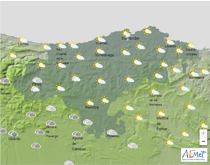 La Agencia Estatal de Meteorología (AEMET) prevé en Cantabria para este viernes día 31 de enero, cielo nuboso o cubierto, predominando las nubes medias en el norte y nubosidad más compacta en el sur, Liébana y Campoo, donde es posible alguna lluvia débil y dispersa durante la mañana.