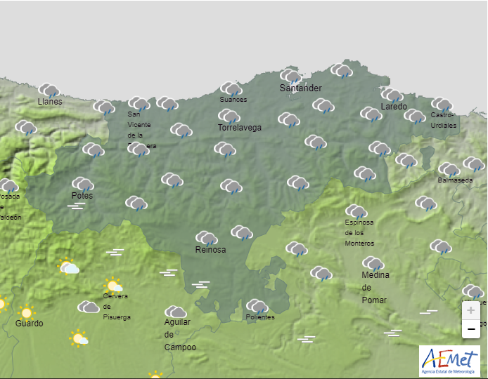 Temperaturas mínimas y máximas previstas: Cabezón de la Sal, 7 y 14 grados; Castro Urdiales, 6 y 16; Potes, 4 y 15; Reinosa, 5 y 12; San Vicente de la Barquera, 8 y 15; Santander, 5 y 15, y Torrelavega, 9 y 15 grados.