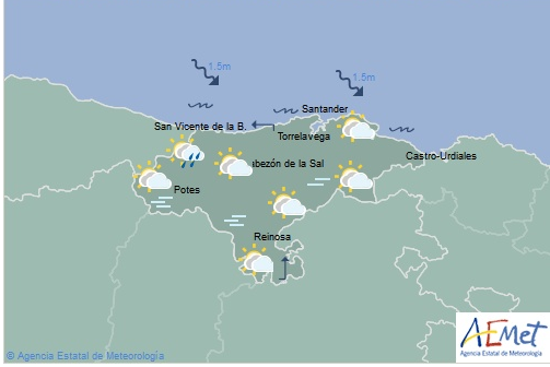 Temperaturas máximas y mínimas previstas: Cabezón de la Sal, 20 y 14 grados; San Vicente de la Barquera, 20 y 16; Santander, 21 y 16; Castro Urdiales, 20 y 15; Potes, 22 y 8; Reinosa, 21 y 6; y Torrelavega, 21 y 14 grados.