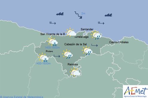 Temperaturas máximas y mínimas previstas: Cabezón de la Sal, 15 y 9 grados; San Vicente de la Barquera, 16 y 11; Santander, 16 y 12; Castro Urdiales, 15 y 12; Potes, 14 y 6; Reinosa, 10 y 2; y Torrelavega, 15 y 10 grados.