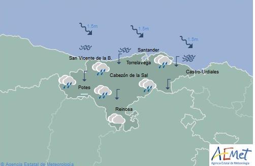 Temperaturas máximas y mínimas previstas: Cabezón de la Sal, 19 y 13 grados; San Vicente de la Barquera, 21 y 14; Santander, 21 y 14; Castro Urdiales, 21 y 14; Potes, 18 y 10; Reinosa, 15 y 3; y Torrelavega, 20 y 16 grados.