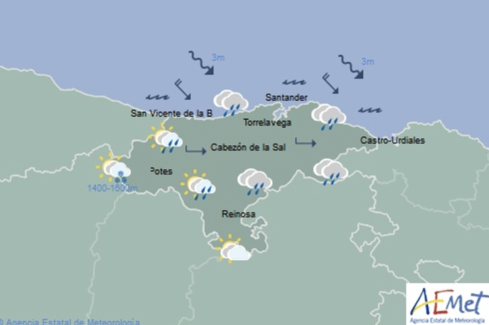 Temperaturas máximas y mínimas previstas: Cabezón de la Sal, 16 y 11 grados; San Vicente de la Barquera, 18 y 11; Santander, 17 y 12; Castro Urdiales, 16 y 10; Potes, 16 y 8; Reinosa, 11 y 3; y Torrelavega, 16 y 11 grados.