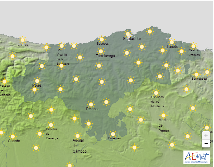 Temperaturas mínimas y máximas previstas: Cabezón de la Sal, 4 y 16 grados; Castro Urdiales, 7 y 16; Potes, 2 y 19; Reinosa, 0 y 14; San Vicente de la Barquera, 4 y 15; Santander, 7 y 15, y Torrelavega, 5 y 17 grados.