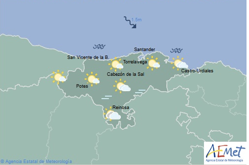 Temperaturas máximas y mínimas previstas: Cabezón de la Sal, 22 y 9 grados; San Vicente de la Barquera, 21 y 13; Santander, 22 y 11; Castro Urdiales, 20 y 12; Potes, 24 y 14; Reinosa, 20 y 8; y Torrelavega, 23 y 9 grados.