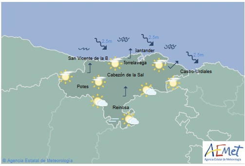 Temperaturas máximas y mínimas previstas: Cabezón de la Sal, 16 y 8 grados; San Vicente de la Barquera, 16 y 7; Santander, 16 y 8; Castro Urdiales, 15 y 8; Potes, 17 y 4; Reinosa, 13 y 4; y Torrelavega, 17 y 8 grados.