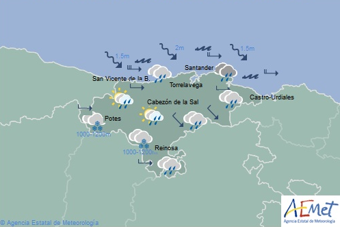 Temperaturas máximas y mínimas previstas: Cabezón de la Sal, 14 y 7 grados; San Vicente de la Barquera, 15 y 8; Santander, 16 y 9; Castro Urdiales, 15 y 7; Potes, 13 y 3; Reinosa, 10 y -2; y Torrelavega, 14 y 8 grados.