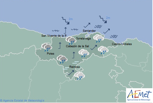 Temperaturas máximas y mínimas previstas: Cabezón de la Sal, 14 y 8 grados; San Vicente de la Barquera, 15 y 8; Santander, 15 y 8; Castro Urdiales, 15 y 7; Potes, 15 y 4; Reinosa, 10 y 1; y Torrelavega, 15 y 8 grados.