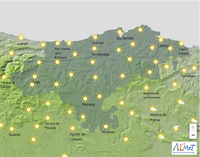 Temperaturas mínimas y máximas previstas: Cabezón de la Sal, 14 y 24 grados; Castro Urdiales, 16 y 22; Potes, 15 y 26; Reinosa, 10 y 23; San Vicente de la Barquera, 15 y 23; Santander, 15 y 23, y Torrelavega, 13 y 25 grados.