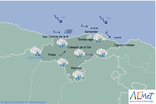 Temperaturas máximas y mínimas previstas: Cabezón de la Sal, 15 y 7 grados; San Vicente de la Barquera, 16 y 7; Santander, 16 y 8; Castro Urdiales, 16 y 7; Potes, 14 y 6; Reinosa, 9 y 1; y Torrelavega, 15 y 8 grados.