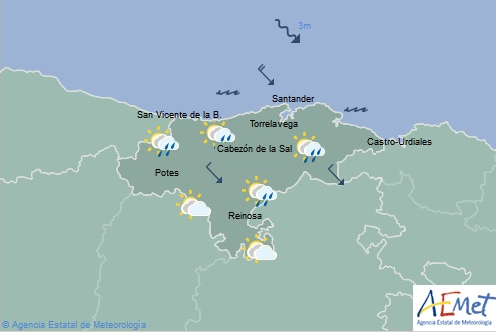 Temperaturas máximas y mínimas previstas: Cabezón de la Sal, 19 y 12 grados; San Vicente de la Barquera, 20 y 14; Santander, 20 y 13; Castro Urdiales, 19 y 13; Potes, 19 y 8; Reinosa, 14 y 3; y Torrelavega, 19 y 14 grados.