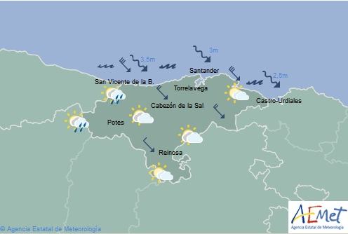 Temperaturas máximas y mínimas previstas: Cabezón de la Sal, 13 y 9 grados; San Vicente de la Barquera, 14 y 7; Santander, 14 y 10; Castro Urdiales, 14 y 9; Potes, 13 y 1; Reinosa, 8 y 1; y Torrelavega, 14 y 10 grados.