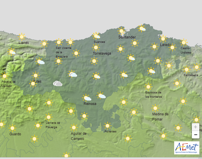 Temperaturas mínimas y máximas previstas: Cabezón de la Sal, 14 y 24 grados; Castro Urdiales, 16 y 22; Potes, 15 y 26; Reinosa, 10 y 23; San Vicente de la Barquera, 15 y 23; Santander, 15 y 23, y Torrelavega, 13 y 25 grados.
