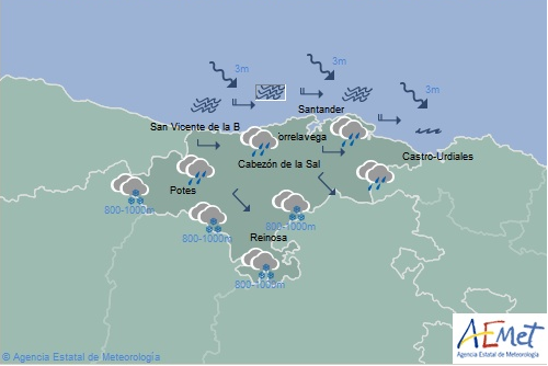 Temperaturas máximas y mínimas previstas: Cabezón de la Sal, 10 y 5 grados; San Vicente de la Barquera, 10 y 6; Santander, 11 y 8; Castro Urdiales, 11 y 8; Potes, 12 y 2; Reinosa, 10 y 0; y Torrelavega, 10 y 6 grados.