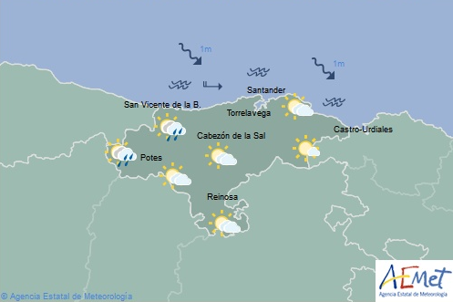 Temperaturas máximas y mínimas previstas: Cabezón de la Sal, 22 y 17 grados; San Vicente de la Barquera, 23 y 17; Santander, 22 y 16; Castro Urdiales, 22 y 16; Potes, 23 y 11; Reinosa, 21 y 6; y Torrelavega, 22 y 16 grados.
