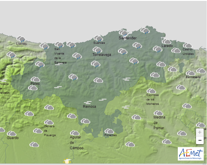 La Agencia Estatal de Meteorología (AEMET) prevé en Cantabria para este martes, día 11, nuboso o cubierto con lluvias débiles y dispersas por la mañana, que no se esperan en el extremo sur, a dónde se extienden por la tarde intensificándose en el resto. Brumas o nieblas matinales en zonas altas del interior.