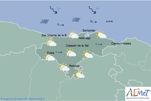 Temperaturas máximas y mínimas previstas: Cabezón de la Sal, 19 y 9 grados; San Vicente de la Barquera, 20 y 12; Santander, 20 y 14; Castro Urdiales, 19 y 13; Potes, 20 y 5; Reinosa, 15 y 1; y Torrelavega, 20 y 11 grados.