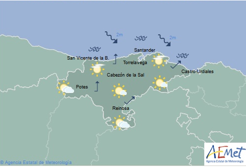 Temperaturas máximas y mínimas previstas: Cabezón de la Sal, 19 y 11 grados; San Vicente de la Barquera, 17 y 10; Santander, 18 y 11; Castro Urdiales, 18 y 11; Potes, 19 y 7; Reinosa, 15 y 4; y Torrelavega, 20 y 10 grados.