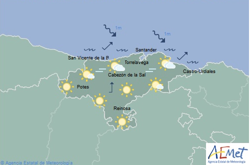 Temperaturas máximas y mínimas previstas: Cabezón de la Sal, 14 y 6 grados; San Vicente de la Barquera, 15 y 7; Santander, 15 y 8; Castro Urdiales, 14 y 7; Potes, 16 y 3; Reinosa, 12 y 0; y Torrelavega, 15 y 6 grados.