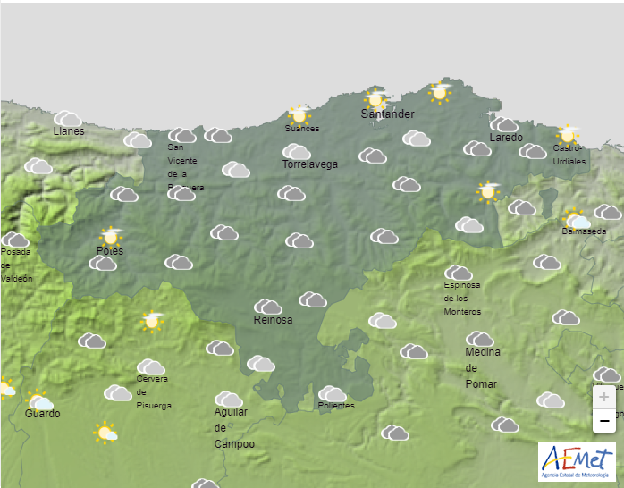 Temperaturas mínimas y máximas previstas: Cabezón de la Sal, 11 y 16 grados; Castro Urdiales, 12 y 16; Potes, 10 y 18; Reinosa, 6 y 14; San Vicente de la Barquera, 12 y 16; Santander, 12 y 16, y Torrelavega, 12 y 17 grados.