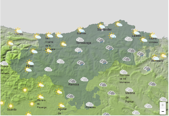 Temperaturas mínimas y máximas previstas: Cabezón de la Sal, 10 y 16 grados; Castro Urdiales, 13 y 16; Potes, 8 y 16; Reinosa, 6 y 12; San Vicente de la Barquera, 11 y 17; Santander, 13 y 17, y Torrelavega, 10 y 17 grados.