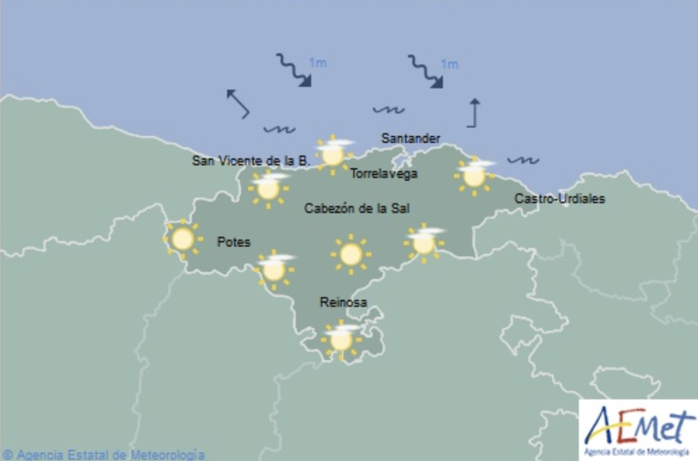 Temperaturas máximas y mínimas previstas: Cabezón de la Sal, 28 y 16 grados; San Vicente de la Barquera, 26 y 16; Santander, 26 y 16; Castro Urdiales, 25 y 17; Potes, 31 y 15; Reinosa, 30 y 11; y Torrelavega, 29 y 15 grados.