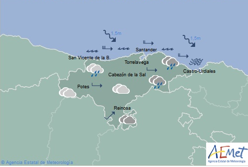 Temperaturas máximas y mínimas previstas: Cabezón de la Sal, 17 y 15 grados; San Vicente de la Barquera, 18 y 15; Santander, 18 y 14; Castro Urdiales, 17 y 13; Potes, 19 y 11; Reinosa, 15 y 9; y Torrelavega, 18 y 15 grados.