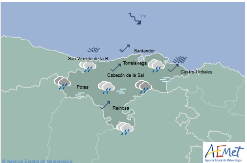 Temperaturas máximas y mínimas previstas: Cabezón de la Sal, 18 y 10 grados; San Vicente de la Barquera, 17 y 10; Santander, 19 y 11; Castro Urdiales, 18 y 11; Potes, 17 y 6; Reinosa, 12 y 3; y Torrelavega, 18 y 10 grados.