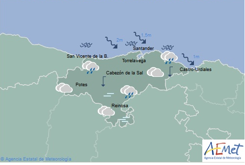 Temperaturas máximas y mínimas previstas: Cabezón de la Sal, 11 y 8 grados; San Vicente de la Barquera, 12 y 9; Santander, 13 y 9; Castro Urdiales, 12 y 8; Potes, 8 y 1; Reinosa, 6 y -1; y Torrelavega, 13 y 9 grados.