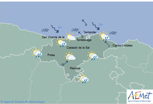 Temperaturas máximas y mínimas previstas: Cabezón de la Sal, 21 y 7 grados; San Vicente de la Barquera, 20 y 8; Santander, 20 y 9; Castro Urdiales, 20 y 10; Potes, 18 y 6; Reinosa, 14 y 4; y Torrelavega, 21 y 8 grados.