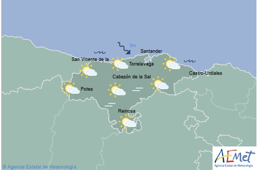 Temperaturas máximas y mínimas previstas: Cabezón de la Sal, 22 y 15 grados; San Vicente de la Barquera, 21 y 15; Santander, 22 y 15; Castro Urdiales, 21 y 14; Potes, 26 y 13; Reinosa, 24 y 6; y Torrelavega, 22 y 14 grados.