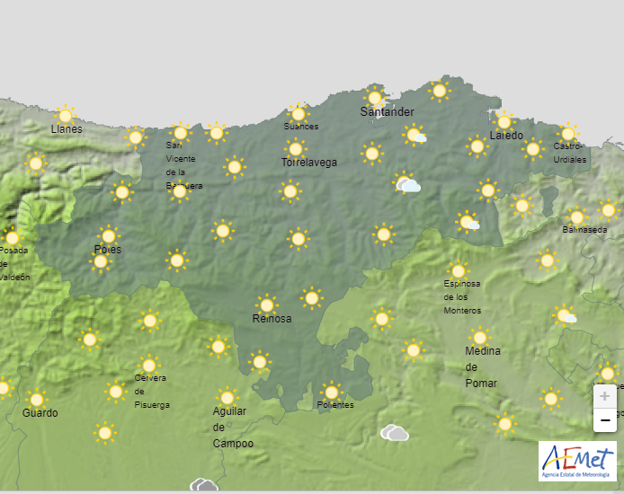 Temperaturas mínimas y máximas previstas: Cabezón de la Sal, 7 y 17 grados; Castro Urdiales, 6 y 16; Potes, 3 y 18; Reinosa, 3 y 14; San Vicente de la Barquera, 7 y 16; Santander, 6 y 17, y Torrelavega, 7 y 18 grados.