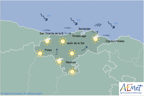 Temperaturas máximas y mínimas previstas: Cabezón de la Sal, 12 y 4 grados; San Vicente de la Barquera, 13 y 3; Santander, 13 y 0; Castro Urdiales, 13 y 3; Potes, 10 y -2; Reinosa, 7 y -4; y Torrelavega, 12 y 5 grados.
