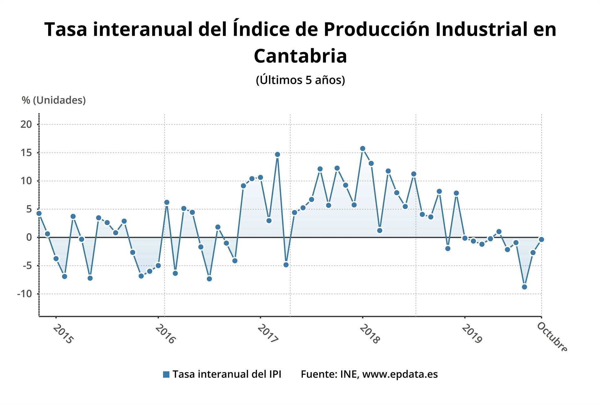 La producción industrial ha bajado un -0,4% en octubre en Cantabria en comparación con el mismo mes de 2018, frente al incremento del 1,1% registrado en el conjunto del país, según ha informado hoy el Instituto Nacional de Estadística (INE).