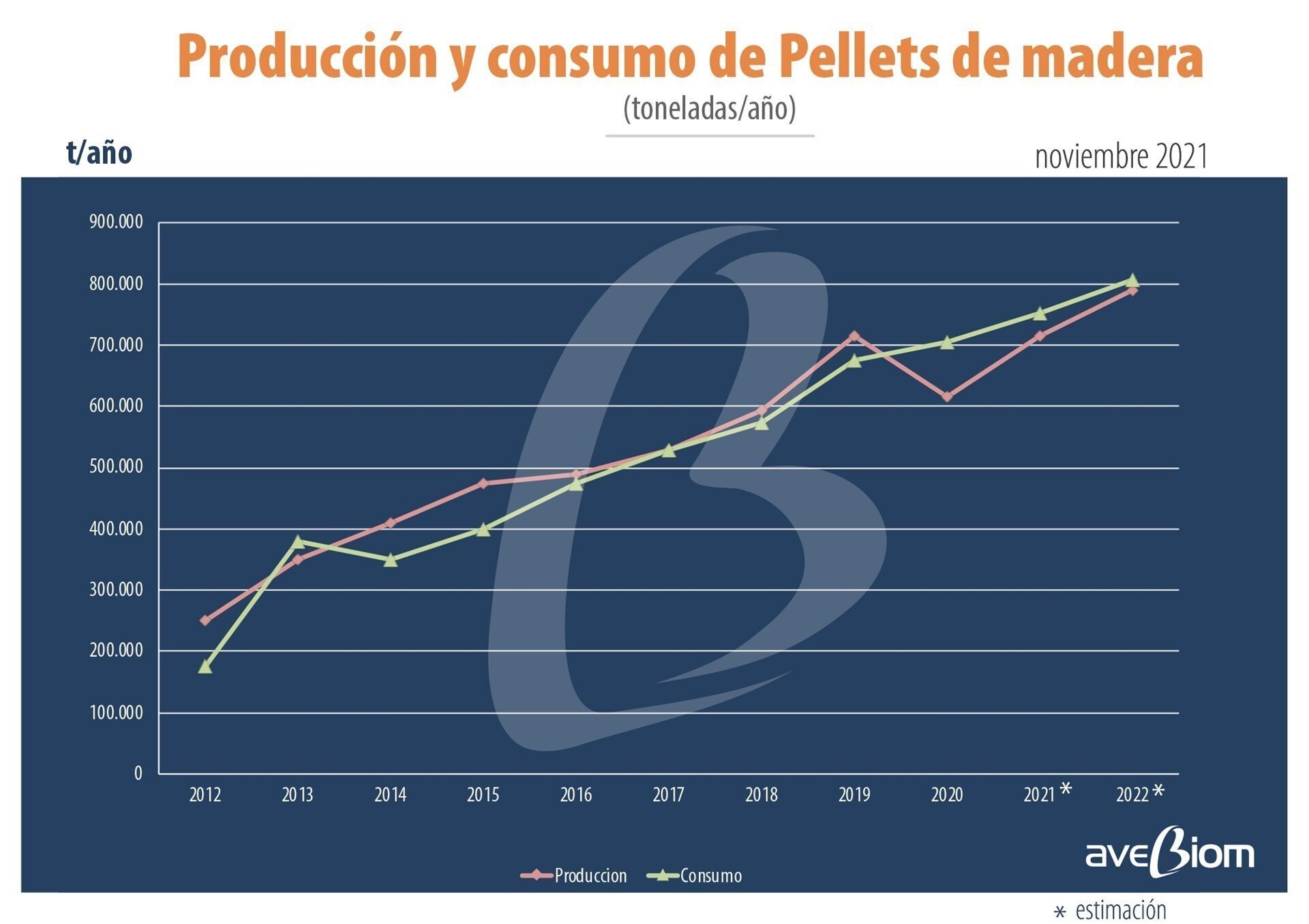 Asimismo, la previsión es que a lo largo de 2022 la producción real de pellets de madera crezca hasta las 790.000 toneladas, lo que supondría un incremento del 426 por ciento desde el año 2010, cuando la producción en España fue de 150.000 toneladas.