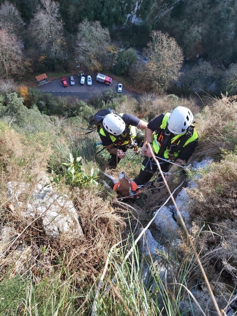 Los bomberos han llegado hasta el lugar atravesando un tramo complejo para el tránsito y, una vez allí, han montado un sistema de rescate vertical y han descendido unos 80 metros hasta donde se encontraba el perro.