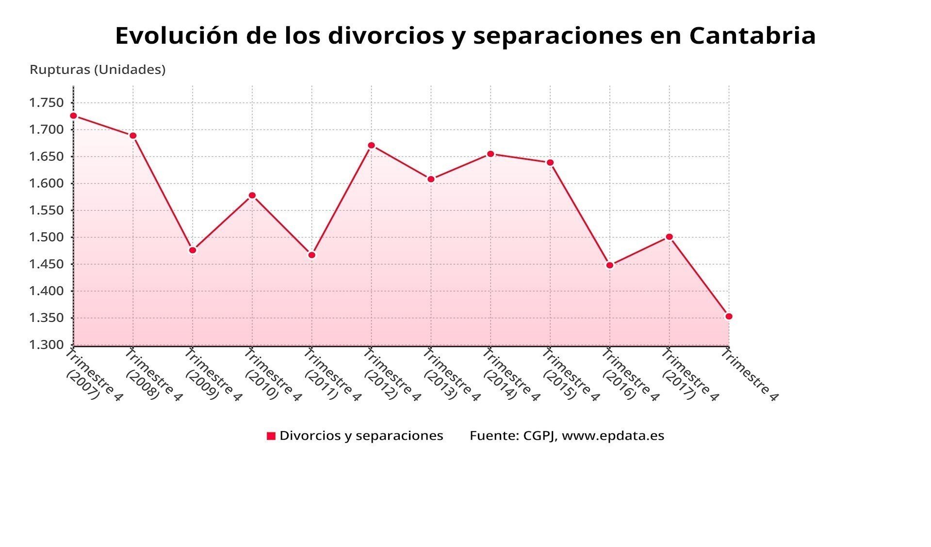 Con estos datos la tasa de rupturas por cada mil habitantes de Cantabria vuelve a estar en 2,1, la tercera más elevada del país, solo inferior a la de Comunidad Valenciana (2,3) y Cataluña (2,2), y una décima superior a la media nacional (2).